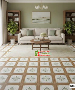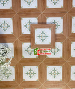 Điểm nhấn ấn tượng nhất của dòng gạch này chính là tư duy thiết kế “trong vuông ngoài tròn” đầy sáng tạo. Phần trung tâm của viên gạch là những họa tiết đối xứng cổ điển, gợi nhớ về những giá trị kiến trúc xưa cũ nhưng không hề lỗi thời. Bao quanh lớp họa tiết đó là phần viền giả vân gỗ được xử lý tinh xảo, tạo cảm giác như mỗi viên gạch là một ô sàn gỗ cao cấp được khảm những miếng sứ nghệ thuật một cách tỉ mỉ.