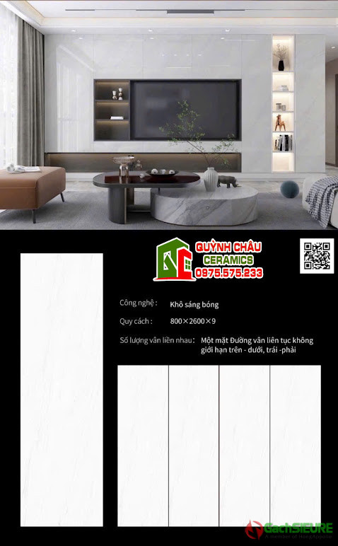 Trong thế giới vật liệu xây dựng hiện đại, gạch đá nung kết đang dần trở thành lựa chọn hàng đầu cho những công trình đòi hỏi sự sang trọng, tinh tế và bền bỉ. Nổi bật trong số đó là dòng gạch 80×260 đá nung kết bóng trắng vân nhẹ nhập khẩu từ Trung Quốc – một sản phẩm không chỉ mang vẻ đẹp thẩm mỹ cao mà còn sở hữu những ưu điểm vượt trội về chất lượng. Với kích thước lớn 80×260 cm, sản phẩm này giúp giảm thiểu mạch gạch, tạo nên một mặt phẳng liền mạch, mở rộng không gian và mang lại cảm giác thoáng đãng, đẳng cấp.