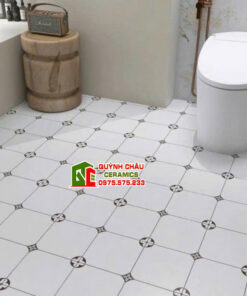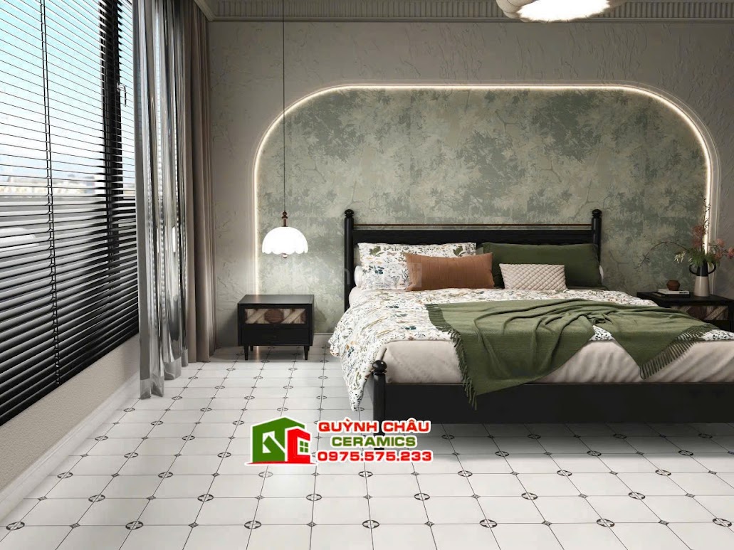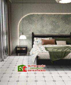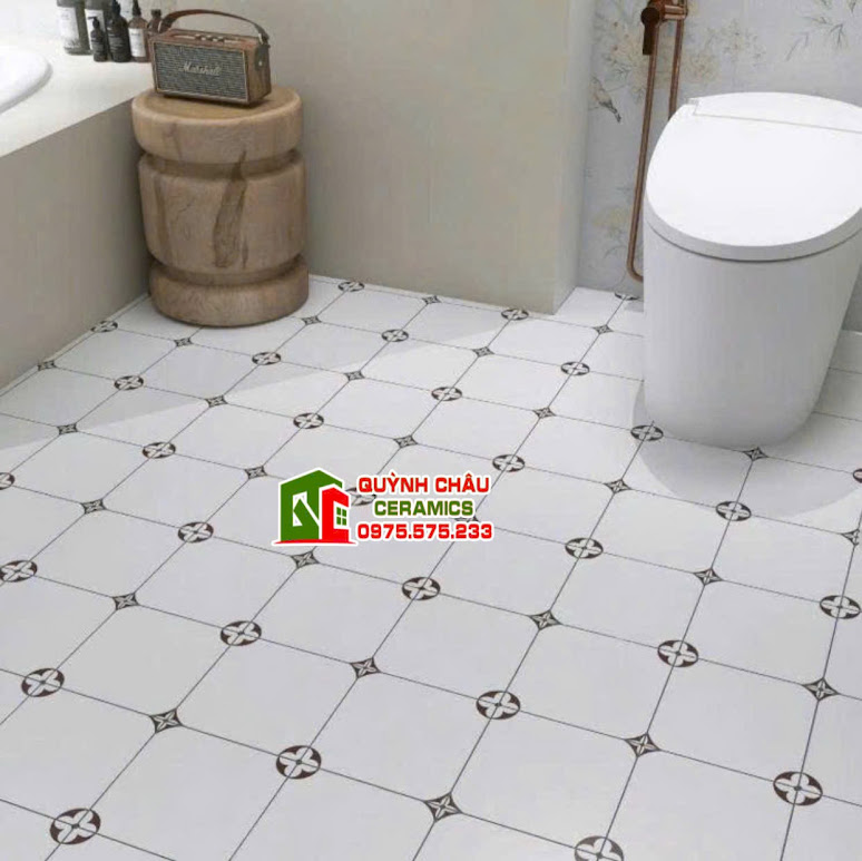 Sản phẩm gây ấn tượng mạnh mẽ với gam màu trắng kem nền nã, tạo cảm giác nhẹ nhàng nhưng không kém phần sang trọng. Điểm nhấn đặc biệt nằm ở họa tiết lấy cảm hứng từ biểu tượng Louis Vuitton danh tiếng, được sắp xếp đối xứng hoàn hảo. Sự kết hợp này không chỉ mang đến cái nhìn độc đáo, hiện đại mà còn khẳng định gu thẩm mỹ tinh tế của gia chủ. Với bề mặt mờ mịn màng, gạch giúp giảm độ chói, tạo chiều sâu cho không gian và đảm bảo an toàn tối đa khi di chuyển.