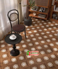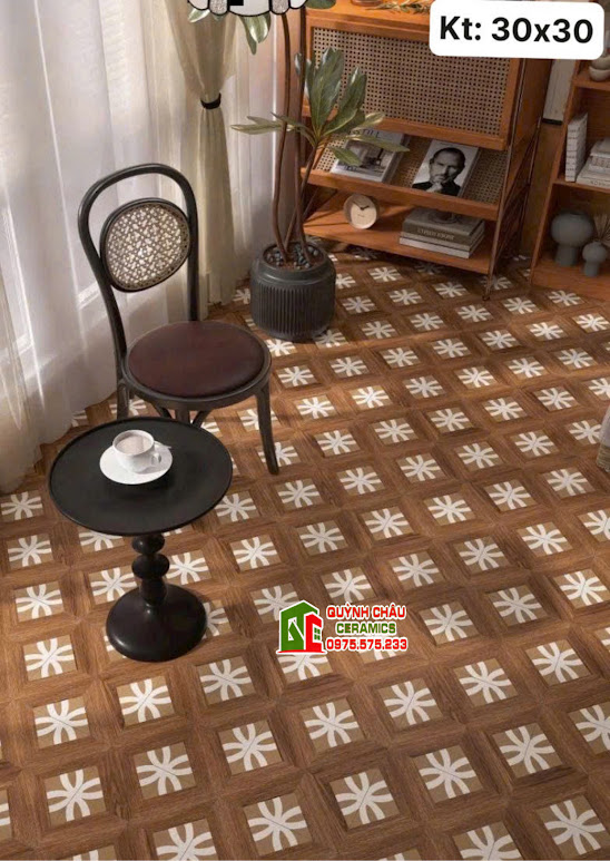 Gạch bông 30×30 nền vân gỗ hoạ tiết bông hoa trắng đối xứng