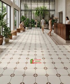 Khi lát trên diện tích lớn, các họa tiết ở góc sẽ kết nối với nhau tạo thành những đóa hoa hoặc khung viền đối xứng hoàn mỹ. Màu nâu đậm của hoa văn tạo nên độ tương phản rõ nét trên nền kem, không chỉ mang lại cảm giác ấm cúng mà còn tạo chiều sâu cho không gian. Đây là sự kết hợp tuyệt vời giữa nét đẹp cổ điển truyền thống và phong cách sang trọng, hiện đại.