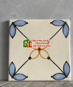 Điểm nhấn đầu tiên của mẫu gạch này nằm ở thiết kế bề mặt đầy tính nghệ thuật. Trên nền gạch màu trắng kem nhã nhặn, các họa tiết nhỏ đối xứng được phối màu khéo léo giữa sắc xanh cổ điển và nâu vàng ấm áp.