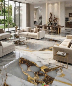 Gạch lát nền 60×120 vân đá trắng vàng bóng kính sang trọng