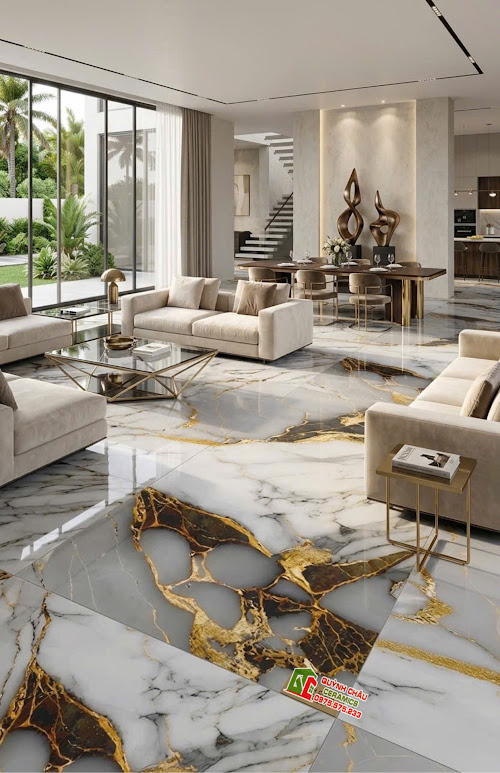 Sự đan xen này không chỉ tạo nên chiều sâu thị giác mà còn giúp không gian trở nên nổi bật và đầy sức sống. Mỗi viên gạch như một bức tranh nghệ thuật độc bản, giúp mặt sàn trở thành tâm điểm của sự chú ý, tôn lên vẻ đẹp kiêu sa và đẳng cấp cho ngôi nhà.