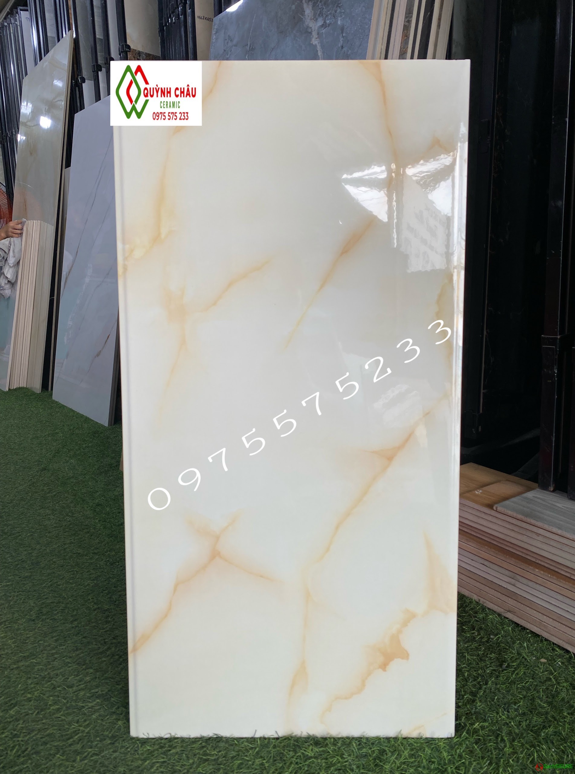 Gạch men 40×80 vát cạnh kem vân vàng bóng kính