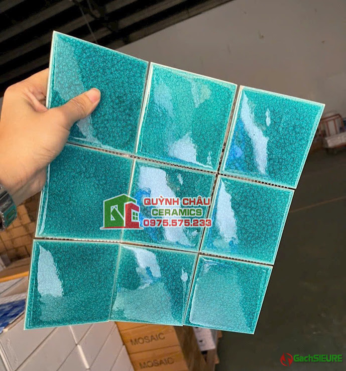 Gạch mosaic 10×10 gốm men rạn màu xanh bề mặt bóng