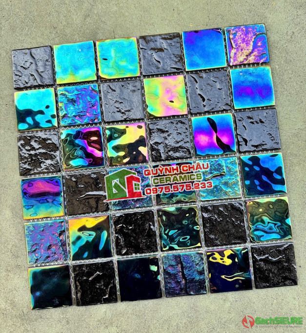 Gạch mosaic 48×48 thủy tinh lấp lánh siêu đẹp | Gạch mosaic được ghép lại từ các mảnh thủy tinh với gam màu lấp lánh bề mặt bóng,được cấu tạo từ các viên chip thủy tinh nhỏ có kích thước 48×48 vuông cố định với nhau bằng lớp vỉ lưới dính liên kết với nhau và phổ biến được sử dụng trong trang trí nội thất / ngoại thất.Công dụng chính của gạch mosaic thủy tinh dùng để ốp lát phòng bếp,mặt tiền nhà,phòng tắm,bể bơi,đài phun nước,ốp trang trí spa.Những mẫu gạch mosaic thủy tinh khi ốp lát có khả năng phản quang đẹp mắt,màu sắc nổi bật cực kỳ ấn tượng,dù được ốp dán trang trí ở trong không gian nào cũng mang lại vẻ đẹp sang trọng đầy đẳng cấp.