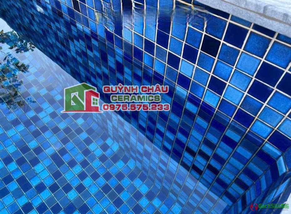 Gạch mosaic ốp lát hồ bơi mix màu xanh khiến không gian nổi bật hơn,đồng thời màu xanh biển sẽ phản quang với ánh nắng và mặt hồ bơi,bể bơi trở nên lấp lánh hơn.Gạch mosaic gốm bề mặt bền màu,phù hợp dùng trong trang trí nội ngoại thất,các tông khác sẽ tạo nên thẩm mỹ kiến trúc đẹp,cao cấp,hiện đại.Gạch ốp lát mosaic là sản phẩm ứng dụng trang trí tuyệt vời cho các bức tường nổi bật của căn nhà,mang đến cho bất kỳ thiết kế nào.