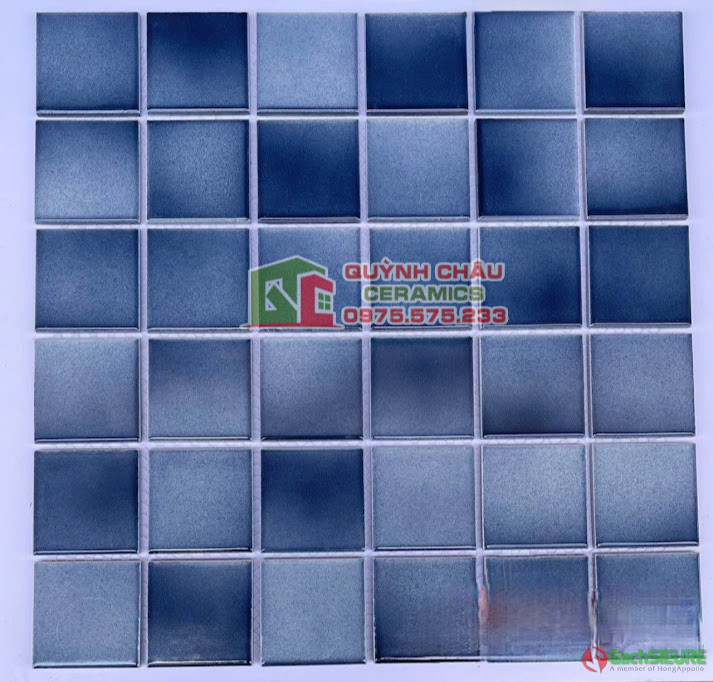 Gạch mosaic gốm hồ bơi phối trộn màu | Gạch mosaic gốm bề mặt mix phối màu xanh,men trơn,được cấu tạo các viên chip có kích thước 48mm x 48mm ô hình vuông được gép liên kết lớp keo kết dính lớp vỉ lưới gắn lại lại với nhau tạo thành một mảng vỉ có kích thước 306mm x 306mm.Gạch mosaic gốm chip 48mm x 48mm màu xanh ốp lát hồ bơi phối trộn nhiều màu giúp đánh lừa thị giác,tạo cảm giác nước trong,xanh và sạch hơn nhiều.Nước hồ bơi phản chiếu màu sắc của gạch ốp,độ trong xanh của nước sẽ phụ thuộc độ màu đậm nhạt của gạch ốp.