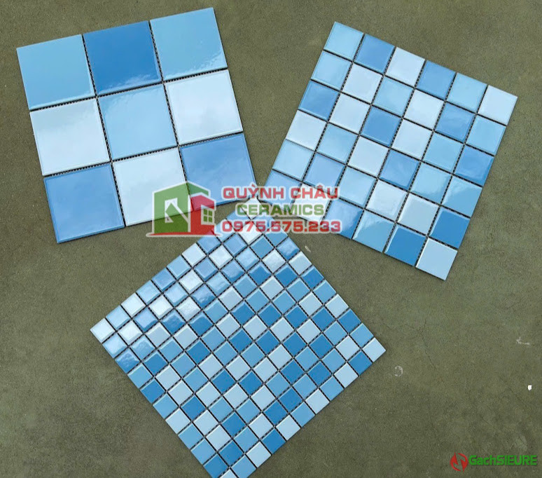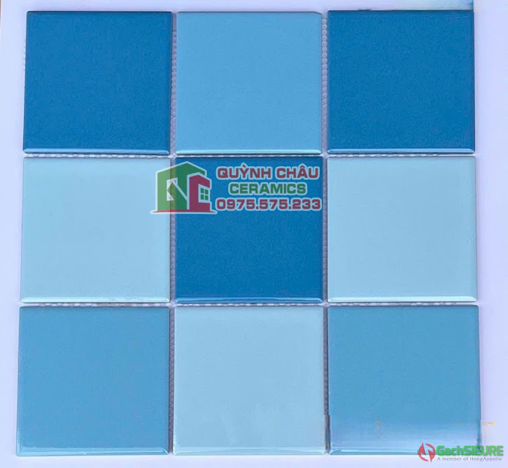 Gạch mosaic gốm màu xanh biển mix phối màu | Gạch mosaic gốm bề mặt mix phối màu xanh biển,men bóng,được cấu tạo các viên chip có kích thước 97mm x 97mm ô hình vuông được gép liên kết lớp keo kết dính lớp vỉ lưới gắn lại lại với nhau tạo thành một mảng vỉ có kích thước 300mm x 300mm.Gạch mosaic gốm chip 97mm x 97mm màu xanh biển ốp lát hồ bơi phối trộn nhiều màu giúp đánh lừa thị giác,tạo cảm giác nước trong,xanh và sạch hơn nhiều.Nước hồ bơi phản chiếu màu sắc của gạch ốp,độ trong xanh của nước sẽ phụ thuộc độ màu đậm nhạt của gạch ốp.