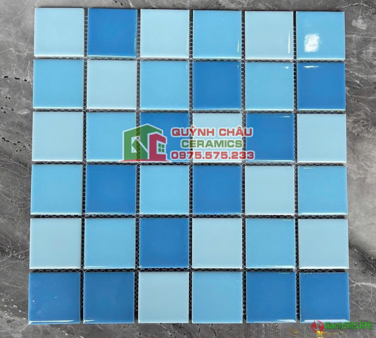 Gạch mosaic gốm phối mix màu xanh biển hồ bơi | Gạch mosaic gốm bề mặt mix phối màu xanh biển,men trơn bóng,được cấu tạo các viên chip có kích thước 48mm x 48mm ô hình vuông được gép liên kết lớp keo kết dính lớp vỉ lưới gắn lại lại với nhau tạo thành một mảng vỉ có kích thước 306mm x 306mm.Gạch mosaic gốm chip 48mm x 48mm màu xanh ốp lát hồ bơi phối trộn nhiều màu giúp đánh lừa thị giác,tạo cảm giác nước trong,xanh và sạch hơn nhiều.Nước hồ bơi phản chiếu màu sắc của gạch ốp,độ trong xanh của nước sẽ phụ thuộc độ màu đậm nhạt của gạch ốp.