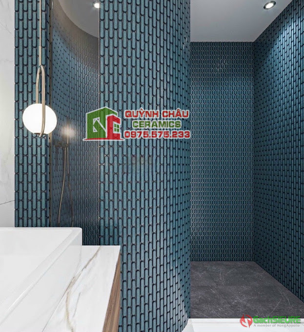 Gạch mosaic que đầu tròn màu xanh rêu bề mặt bóng