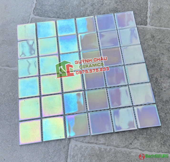 Gạch mosaic thủy tinh 48×48 lấp lánh sang trọng đẹp | Gạch mosaic được ghép lại từ các mảnh thủy tinh với gam màu sang trọng,lấp lánh bề mặt bóng,được cấu tạo từ các viên chip thủy tinh nhỏ có kích thước 48×48 vuông cố định với nhau bằng lớp vỉ lưới dính liên kết với nhau và phổ biến được sử dụng trong trang trí nội thất / ngoại thất.Công dụng chính của gạch mosaic thủy tinh dùng để ốp lát phòng bếp,mặt tiền nhà,phòng tắm,bể bơi,đài phun nước,ốp trang trí spa.Những mẫu gạch mosaic thủy tinh khi ốp lát có khả năng phản quang đẹp mắt,màu sắc nổi bật cực kỳ ấn tượng,dù được ốp dán trang trí ở trong không gian nào cũng mang lại vẻ đẹp sang trọng đầy đẳng cấp.