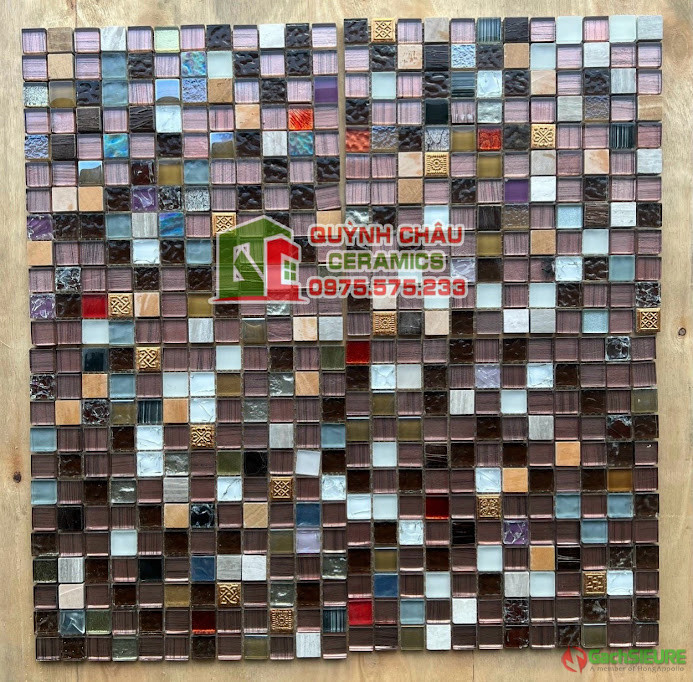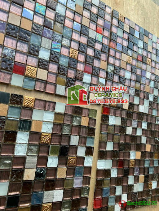 Gạch mosaic thủy tinh màu sắc tinh tế | Gạch mosaic được ghép lại từ các mảnh thủy tinh với gam màu phối trộn điểm họa tiết,hoa văn ngẫu nhiên sắc màu độc đáo,thu hút tôn lên cá tính riêng cho từng không gian.Gạch mosaic được cấu tạo từ các viên thủy tinh nhỏ,các viên chip thủy tinh cố định với nhau bằng lớp vỉ lưới dính liên kết với nhau và phổ biến được sử dụng trong trang trí nội thất / ngoại thất.Công dụng chính của gạch mosaic thủy tinh dùng để ốp lát phòng bếp,mặt tiền nhà,phòng tắm,bể bơi,đài phun nước,ốp trang trí spa.Những mẫu gạch mosaic thủy tinh khi ốp lát có khả năng phản quang đẹp mắt,màu sắc nổi bật cực kỳ ấn tượng,dù được ốp dán trang trí ở trong không gian nào cũng mang lại vẻ đẹp sang trọng đầy đẳng cấp.