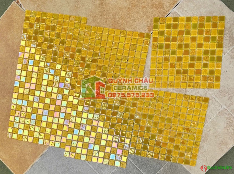 Gạch mosaic thủy tinh màu vàng ốp trang trí đẹp | Gạch mosaic được ghép lại từ các mảnh thủy tinh với gam màu vàng rực rỡ,được cấu tạo từ các viên chip thủy tinh nhỏ,cố định với nhau bằng lớp vỉ lưới dính liên kết với nhau và phổ biến được sử dụng trong trang trí nội thất / ngoại thất.Công dụng chính của gạch mosaic thủy tinh dùng để ốp lát phòng bếp,mặt tiền nhà,phòng tắm,bể bơi,đài phun nước,ốp trang trí spa.Những mẫu gạch mosaic thủy tinh khi ốp lát có khả năng phản quang đẹp mắt,màu sắc nổi bật cực kỳ ấn tượng,dù được ốp dán trang trí ở trong không gian nào cũng mang lại vẻ đẹp sang trọng đầy đẳng cấp.