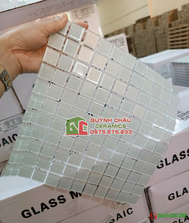 Gạch mosaic vỉ thủy tinh màu trắng đơn sắc | Gạch mosaic được ghép lại từ các mảnh thủy tinh với gam màu trắng đơn sắc dựu nhẹ nhàng.Gạch mosaic màu trắng đơn được cấu tạo từ các viên thủy tinh nhỏ có kích thước viên chip 25×25 vuông cố định với nhau bằng lớp vỉ lưới dính liên kết với nhau và phổ biến được sử dụng trong trang trí nội thất / ngoại thất.Công dụng chính của gạch mosaic thủy tinh dùng để ốp lát phòng bếp,mặt tiền nhà,phòng tắm,bể bơi,đài phun nước,ốp trang trí spa.Những mẫu gạch mosaic thủy tinh khi ốp lát có khả năng phản quang đẹp mắt,màu sắc nổi bật cực kỳ ấn tượng,dù được ốp dán trang trí ở trong không gian nào cũng mang lại vẻ đẹp sang trọng đầy đẳng cấp.
