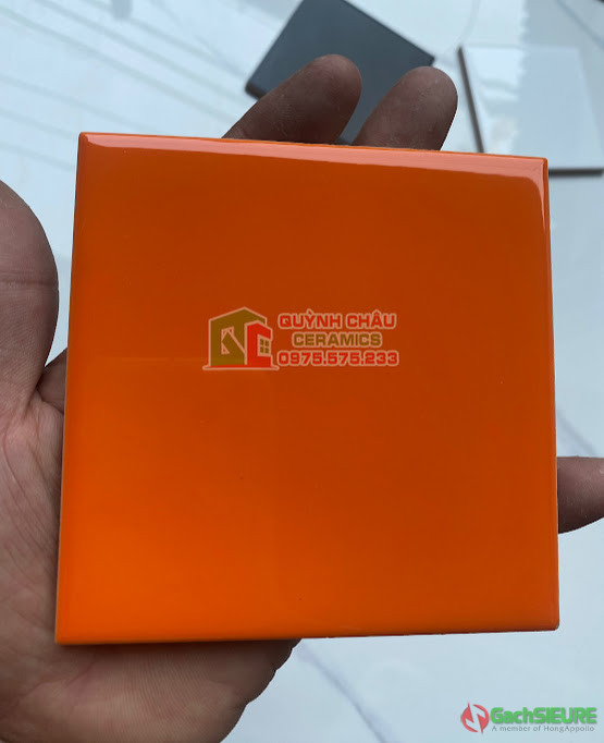 Gạch thẻ 10×10 màu cam đơn sắc men bóng | Gạch thẻ 10×10 cm bề mặt màu cam đơn sắc với lớp men tráng phủ bóng,sản phẩm này với kích thước thẻ hình vuông nhỏ nên dễ dàng sử dụng ốp hay dán tường nhiều khu vực không gian một cách linh hoạt.Hơn nữa gạch thẻ 10×10 cm kích thước vừa phải hình vuông nhỏ,có thể ốp hay dán mọi vị trí trong không gian,dù là khu vực nhỏ nhất trong ngôi nhà cần thi công gạch thẻ 10×10 vẫn có thể ốp tường hay ốp trang trí theo ý muốn tạo không gian trở nên sang trọng,hiện đại,sạch sẽ và ấn tượng,mang đến một phong cách riêng độc đáo cho từng công trình với các tính năng nổi bật.