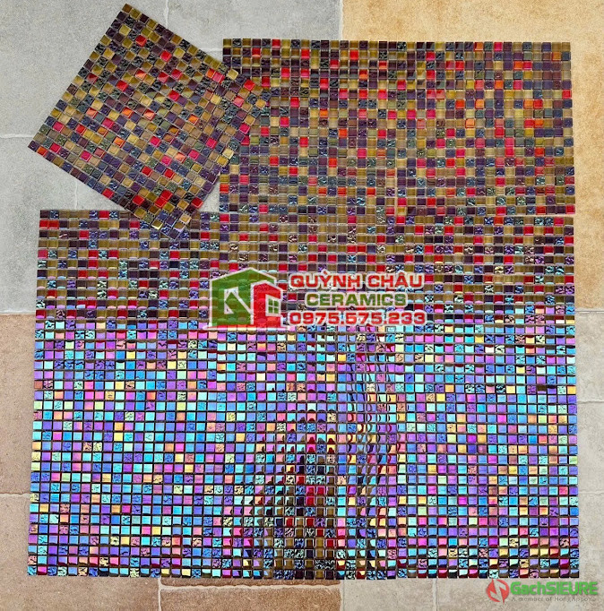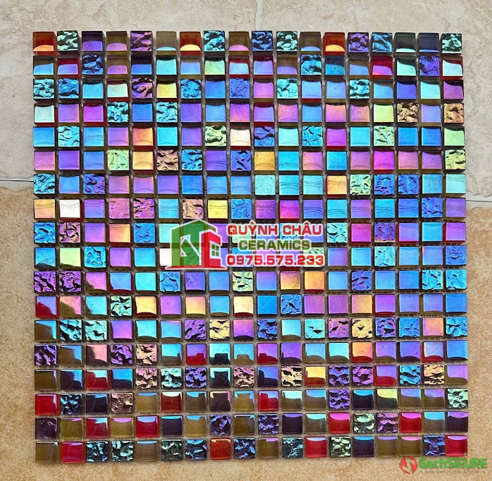 Gạch trang trí mosaic thủy tinh ốp dán tường đẹp | Gạch mosaic được ghép lại từ các mảnh thủy tinh với nhiều sắc gam màu ánh ngọc trai mix phối độc đáo,được cấu tạo từ các viên chip thủy tinh nhỏ,cố định với nhau bằng lớp vỉ lưới dính liên kết với nhau và phổ biến được sử dụng trong trang trí nội thất / ngoại thất.Công dụng chính của gạch mosaic thủy tinh dùng để ốp lát phòng bếp,mặt tiền nhà,phòng tắm,bể bơi,đài phun nước,ốp trang trí spa.Những mẫu gạch mosaic thủy tinh khi ốp lát có khả năng phản quang đẹp mắt,màu sắc nổi bật cực kỳ ấn tượng,dù được ốp dán trang trí ở trong không gian nào cũng mang lại vẻ đẹp sang trọng đầy đẳng cấp.
