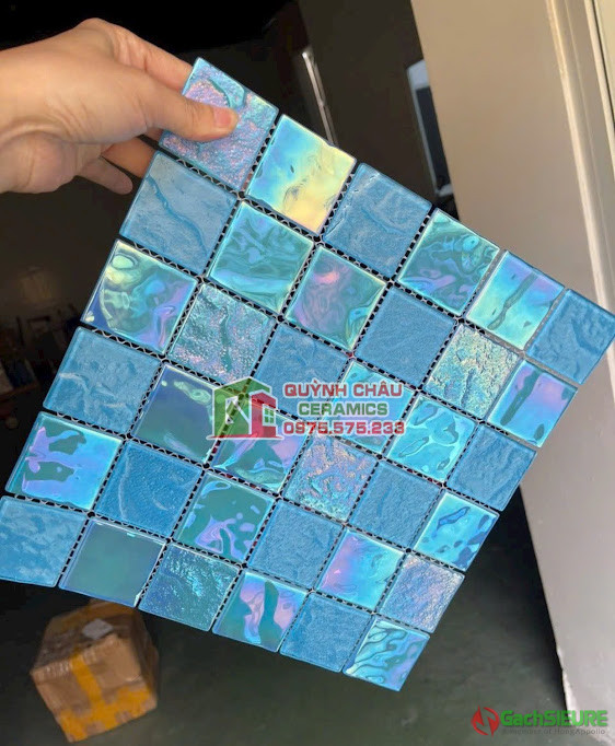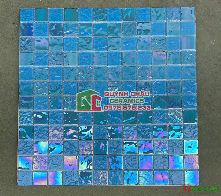 Gạch vỉ mosaic thủy tinh màu xanh hồ bơi | Gạch mosaic được ghép lại từ các mảnh thủy tinh với gam màu xanh tươi mát,được cấu tạo từ các viên chip thủy tinh nhỏ,cố định với nhau bằng lớp vỉ lưới dính liên kết với nhau và phổ biến được sử dụng trong trang trí nội thất / ngoại thất.Công dụng chính của gạch mosaic thủy tinh dùng để ốp lát phòng bếp,mặt tiền nhà,phòng tắm,bể bơi,đài phun nước,ốp trang trí spa.Những mẫu gạch mosaic thủy tinh khi ốp lát có khả năng phản quang đẹp mắt,màu sắc nổi bật cực kỳ ấn tượng,dù được ốp dán trang trí ở trong không gian nào cũng mang lại vẻ đẹp sang trọng đầy đẳng cấp.