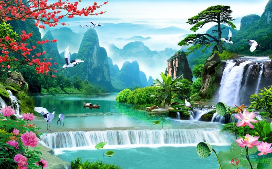 Tranh gạch dán tường phòng khách sơn thủy hữu tình đẹp mới nhất 97